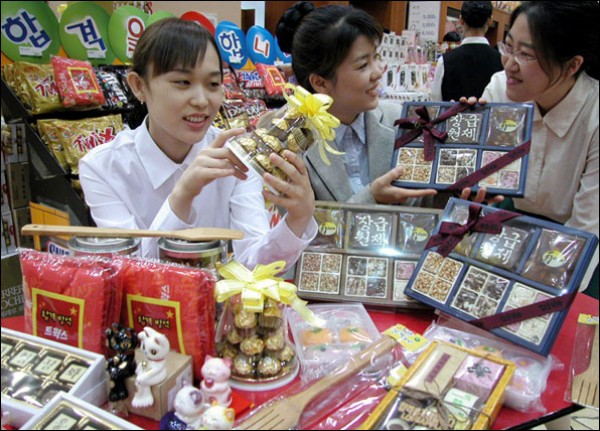 수능시험을 앞둔 신세계 백화점 강남점을 찾은 소비자들이 행운선물 전문매장에서 수능합격기원 초콜릿, 찹쌀떡 등을 고르고 있다…