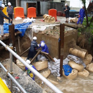 28일 행정타운 근처 비를 맞으며 도로보수공사를 하는 도로공사 직원들
