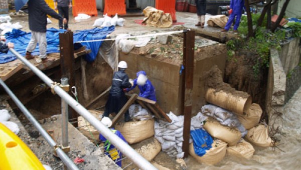 28일 행정타운 근처 비를 맞으며 도로보수공사를 하는 도로공사 직원들