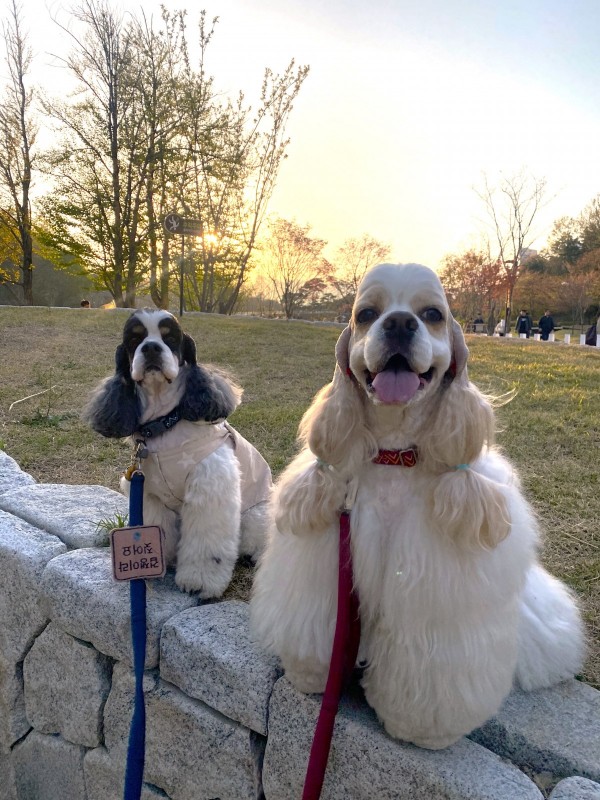 살랑살랑 봄바람 느끼는 노을아래 이쁜 꽃개들