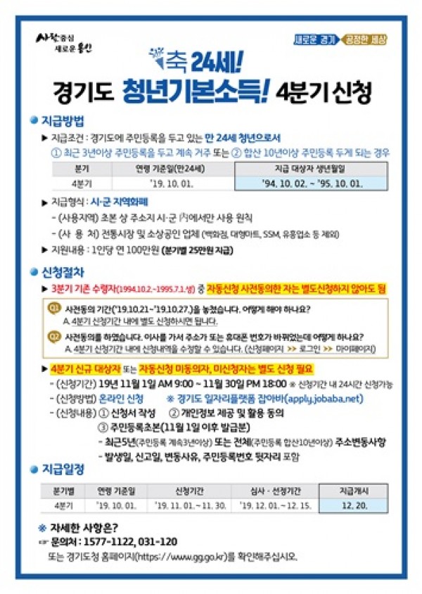 용인시는 11월1일부터 30일 오후6시까지 4분기 청년 기본 소득 지급 신청을 받는다. 대상은 경기도에 3년 이상 계속 거주하거나 거주한 일수의 합이 10년 이상인 1994년 10월2일부터 1995년 10월1일 사이에 출생한 만24세의 용인시 청년이다. 신청은 경기도 일자리플랫폼 잡아바(apply.jobaba.net)에서 회원 …