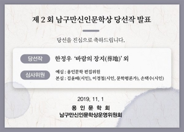 용인시는 1일 ‘제2회 약천 남구만 신인문학상’ 당선작으로 한정우(56, 용인)씨의 ‘바람의 장지(葬地)’외 6편이 선정됐다고 밝혔다. 이 문학상은 용인출신의 조선시대 문신 약천 남구만(11629~1711)의 문학세계를 계승하기 위해 마련했다. 용인문학회가 주최하고 용인시와 의령 남씨 문충공파 종중이 후원했다. …