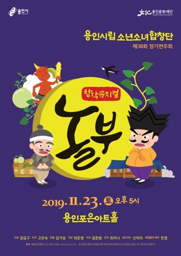(재)용인문화재단(이사장 백군기) 소속 용인시립소년소녀합창단이 오는 11월 23일(토) 오후 5시에 용인포은아트홀에서 를 개최한다. ▲용인시립소년소녀합창단 제38회 정기연주회 - 창작뮤지컬 놀부 포스터 창작뮤지컬 를 중심으로 펼쳐지는 이번 정기연주회는 우리에게 친숙한 ‘흥부와 놀부’ 이야기를 합창단만의 독창적인 안무와 노래로 재…