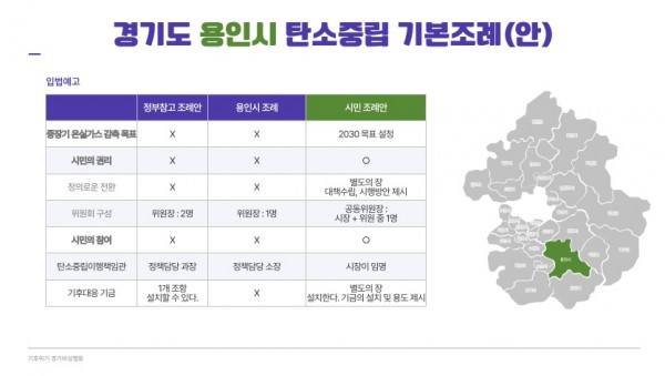 지자체마다 기후위기 대응을 위한 탄소중립ㆍ녹색성장 기본조례를 시급히 제정하고 있다. 용인시도 지난 7월 22일 입법예고해서 시민 의견을 받았다. 용인기후행동과 용인환경정의는 기후위기 경기비상행동의 에 근거한 ‘용인시민안’을 의견으로 제출했다. 하지만 용인시는 시민…