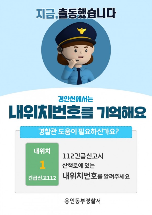 용인동부경찰서(총경 유제열)는 비거주지역 범죄피해신고자의 위치 정보를 빠르게 확인할 수 있도록 지난 6. 30. 지방자치단체와 협력하여 용인시 처인구 경안천 산책로 약 23㎞에「안심존」*을 구축하였다. *200m 구간마다「내위치 번호」표기 / 112시스템에 위치값 연동 / 112신고자가 「내위치 번호」알려 주면 → 경찰이 신고자 위치 정보 확인 → 현장 출동 용인동부…