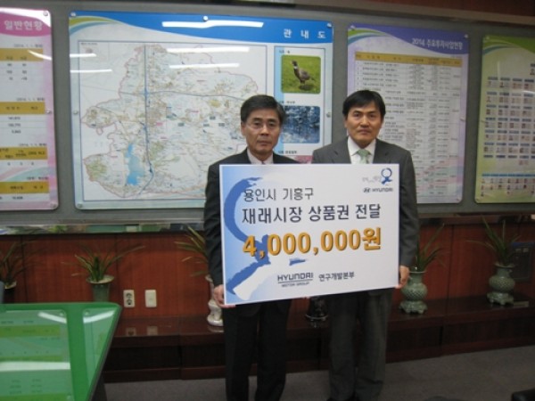 용인시 기흥구 마북동에 위치한 현대자동차(주) 연구소는 23일 기흥구청을 방문 “사랑의 열차 이어달리기”에 동참하기 위해 온누리상품권 4백만원을 기탁했다. ▲ 김도년 기흥구청장, 박경동차장(현대자동차) 현대자동차(주) 연구소는 지난 2011년부터 매년 설과 추석을 맞이하여 300만원 ~500만원 상당의 상품권을 지속적으로 기탁, 이번 기탁금액까지…