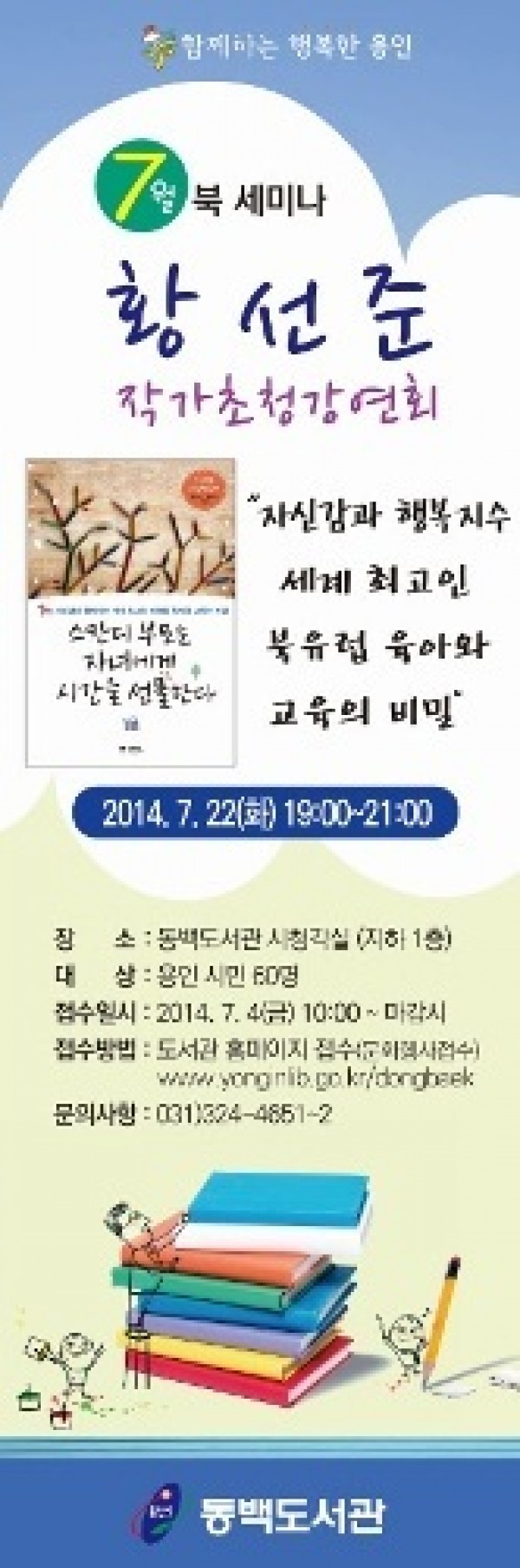 용인시 동백도서관은 7월 22일 오후 7시 황선준 작가를 초청해 ‘스칸디 나비아식 교육법의 비밀, 내 아이는 어떤 부모를 원하는가’란 주제로 야간 북세미나를 진행한다. 스웨덴 국립교육청 간부, 스웨덴 감사원 및 국가 재무행정원을 역임하며 교육 행정의 일선에서 뛴 스웨덴 교육통인 황선준 작가는 2011년 서울시교육연구정보원 원장으로 임명되어 한국으로 돌…