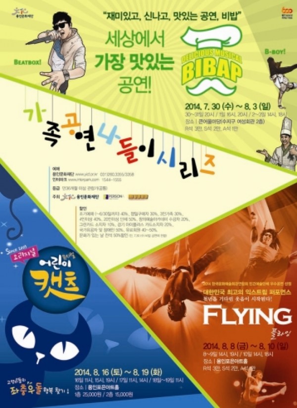 무더위와 함께 점점 다가오는 여름, 온가족이 함께 할 수 있는 공연장으로 나들이를 떠나보자! (재)용인문화재단(대표: 김혁수)은 작년에 이어 올해 여름에도 가족들이 함께 즐길 수 있는 세 개의 공연을 준비하였다. "세상에서 가장 맛있는 공연 〈비밥〉!" 맛있는 공연 〈비밥(BIBAP)〉은 한국의 대표 음식인 "비빔밥"에서 "믹스…