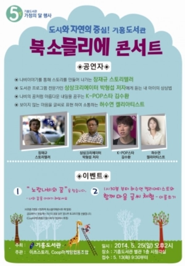 용인시 기흥도서관은 도시와 자연이 공존하는 중심에서 책을 통해 아이들이 창의력을 키우고 무한한 상상력의 나래를 펼 수 있는 특별한 문화프로그램을 연다. 5월 25일(일) 오후 2시 개최되는 ‘북소물리에콘서트’는 특색 있는 강연과 상상 체험, 그리고 음악이 함께 어우러지는 공연으로 <꽃들에게 희망을-트리나 폴러스>의 노랑나비의 꿈을 통해…