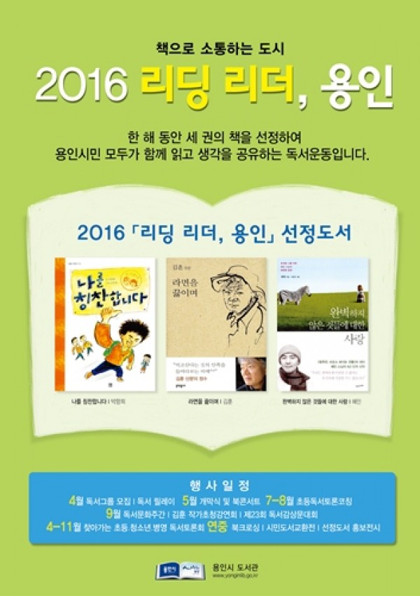 용인시민이 함께 읽을 독서캠페인 대상의 책으로 ‘나를 칭찬합니다(박향희 저)’, ‘라면을 끓이며(김훈 저)’, ‘완벽하지 않은 것들에 대한 사랑(혜민 저)’ 등 3권이 선정됐다. 용인시는 책으로 소통하는 도시를 만들기 위해 추진하는 독서운동 ‘리딩리더, 용인’의 최종도서로 이들 3권을 선정하고 오는 18일 독서캠페인을 시작하는 개막식을 열기로 했다고 …