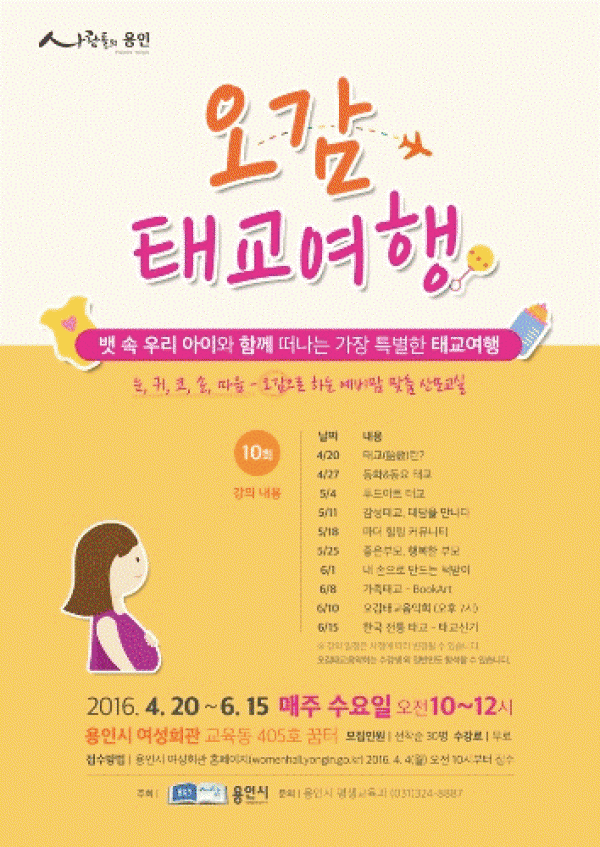 - 용인시, 10일 여성회관서 개최…태교뮤지컬팀 공연도 - 용인시는 오는 10일 오후 7시 수지구 풍덕천동 여성회관에서 관내 임산부와 가족을 대상으로 ‘오감태교 음악회’를 개최한다고 밝혔다. 태교도시를 지향하는 용인시가 ‘오감태교여행’ 프로그램의 하나로 마련한 이번 음악회는 사회자가 임산부의 사연을 청중에게 소개하고 사연에 맞는 음악…