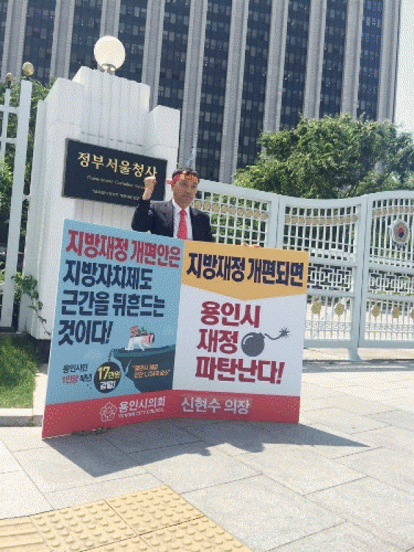용인시의회(의장 신현수)는 지방자치의 근본을 뒤흔드는 지방재정제도 개편안 중단을 위해 6월 3일부터 10일까지 6개 불교부시 시의원들과 함께 릴레이 1인 시위에 참여한다고 밝혔다. 지난 3일에는 신현수 의장, 김기준 부의장, 박만섭 의원, 김운봉 의원이 릴레이 1인 시위에 동참하여 지방재정개편안의 문제점을 지적하고…