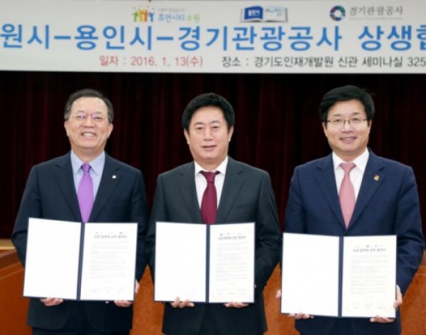 경기남부의 중추도시인 용인시와 수원시가 경기관광공사와 함께 지역관광 활성화를 위한 협력에 적극 나서기로 했다. 용인시는 지난 13일 경기도 인재개발원에서 정찬민 시장과 염태영 수원시장, 홍승표 경기관광공사 사장이 참석한 가운데 지역 관광협력 기반을 강화하는 상생협력 협약을 체결했다고 밝혔다. 협약에 따라 각 기관은 ‘연계협력 실무협의회…