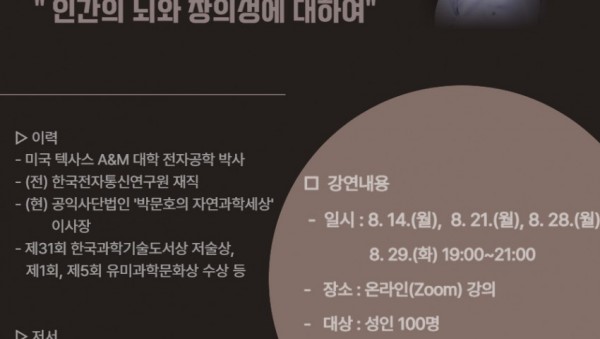 용인특례시는 ‘저녁밥 인문학 특강-인간의 뇌와 창의성에 대하여’를 마련하고 3일부터 참석자를 모집한다고 1일 밝혔다. 시는 직장인이나 학생 등 시민들이 일상을 마친 후에도 인문 소양을 넓힐 수 있도록 ‘저녁밥 인문학 특강’을 진행하고 있다. ‘인간의 뇌와 창의성에 대하여’ 특강에는 ‘뇌과학의 모든 것’, ‘뇌 생각의 출현’의 저자이자 유튜브 채널 ‘박문호 TV’를 통해 뇌과학 분야 지식을 전…