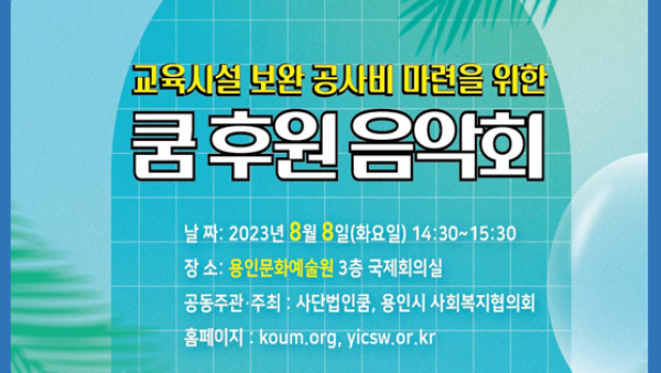 용인시사회복지협의회(회장 윤상형)와 사단법인 쿰(이사장 임영란)은 이번 8월 8일에 쿰 후원음악회를 개최한다. 두 기관은 지역내 장애인, 노인등 취약계층 지원에 많은 노력을 하고 있으며 이번 음악회를 통해 지역사회의 나눔이 고루 퍼질수 있도록 노력한다고 전했다. 이번 음악회는 쿰오케스트라의 ▲모차르트 심포니 40번 1악장을 시작으로 바이올리니스트 박모세의 연주와 성악가 임주…
