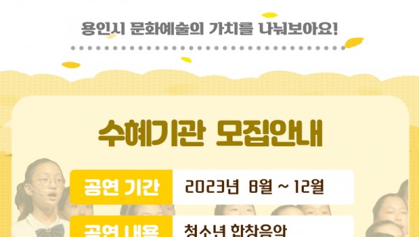 사진설명 : 2023년 찾아가는 음악회 포스터 용인문화재단(이사장 이상일)은 하반기에 진행될 용인시립소년소녀합창단 찾아가는 음악회 ‘우리가치’의 수혜기관을 오는 5월 2일부터 7월까지 모집한다. 용인시립소년소녀합창단은 1998년 창단 이래 정기연주회를 비롯해 지역사회를 위한 공연을 꾸준히 해오고 있으며, 상반기 활동으로 지난 4월 11일 국제요셉학교, 22일 남사도서관에서 두…