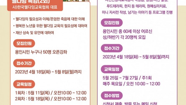 용인특례시가 ‘웰다잉(Well-Dying)에 대해 함께 고민하고 생각하는 프로그램을 마련했다. 시는 오는 5월 25일부터 7월 25일까지 총 10회에 걸쳐 운영하는 ’2023년 어르신 인생노트‘ 상반기 참가자를 20명을 모집한다. 이 프로그램은 삶과 죽음에 대한 깊이 있는 이해를 통해 노년기에 겪을 수 있는 막연한 불안과 우울감 해소에 도움을 주기 위해 마련했다. 프로…