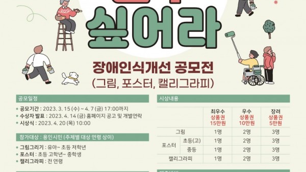 지구촌사회복지재단 용인시수지장애인복지관(관장 한근식)은 오는 4월 7일(금)까지 제 43회 장애인의 날을 기념하여 장애인식개선공모전 ‘함께 살구 싶어라’를 진행한다고 밝혔다. 용인시수지장애인복지관은 매년 4월 20일 장애인의 날을 기념하여 장애인식개선공모전, 피플퍼스트, 나눔행사 등 다채로운 활동을 펼치고 있다. 이번 장애인식개선공모전 ‘함께 …