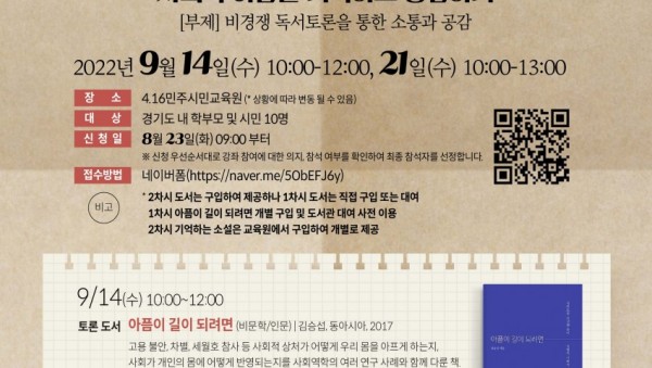 ◦ 학부모 등 도민 대상, 8월 23일부터 신청◦ 9월 14일과 21일, 두 차례 비경쟁 독서 토론 진행 4.16민주시민교육원(원장 전명선)은 4.16 세월호 참사의 의미를 되새기고 민주시민 역량을 강화하기 위해 다음 달 14일과 21일 ‘사회적 아픔을 기억하고 공감하기’라는 주제로 독서 토론을 운영한다. 이번 연수는 학부모 등 도민을 대상으로 독서와 토론 활동으로 …