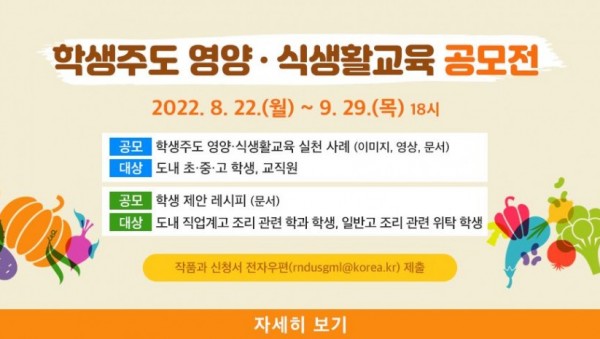◦ 공모전 주제는 ‘자율ㆍ균형ㆍ미래로 성장하는 학생참여 교육급식’◦ 공모 분야는 학생주도 영양ㆍ식생활교육 실천사례, 학생 제안 레시피◦ 도교육청 누리집 참고해 신청서와 자료를 담당자 이메일로 제출 경기도교육청(교육감 임태희)이 학생이 기획하고 만들어가는 교육급식활성화를 위해 2022 학생주도 영양・식생활교육 공모전’을 개최한다. 공모전은 ‘자율ㆍ균형ㆍ미래로 성장하는 학생참여 교육급식’을 주제로 8월…