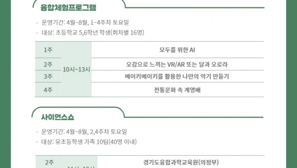 ◦융합과학교육원, 4월부터 8월까지 미래와 만나는 토요체험교실 운영◦체험교실, 매주 융합체험과 격주 사이언스 쇼로 나눠 진행◦참가 희망 학생, 경기도융합과학교육원 누리집 통해 신청 가능 미래와 만나는 토요체험교실 홍보 이미지&n…