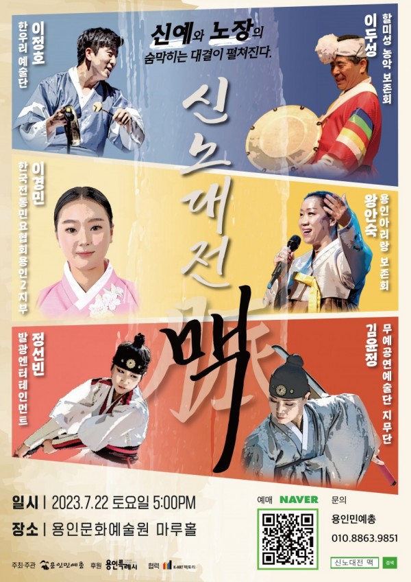 용인특례시에서 공모한 에 선정된 용인민예총의 ‘신노대전 맥(脈)’이 오는 7월 22일 용인시청 문화예술원 마루홀 무대에 오른다. ‘신예와 노장의 숨막히는 대전’이라는 컨셉으로 진행되는 본 공연은 용인민예총이 주최, 주관하고 용인특례시가 후원한다. ‘신노대전 맥(脈)’을 기획한 최양선 연출은 “용인특례시는 지리학적으로나 인구통계학적으로 문화예술 발전에 무한한 가능성이 있는 도시이다. 10개가 넘는 …