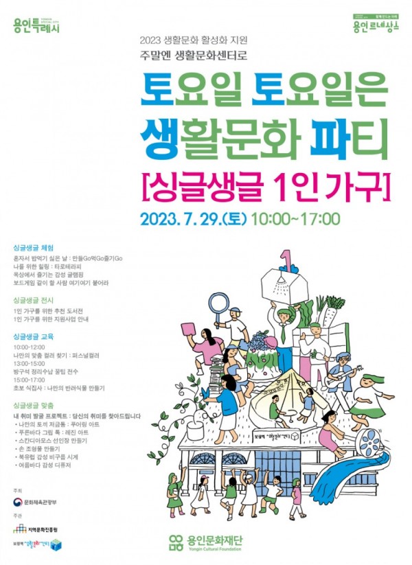 '토요일 토요일은 생활문화 파티-싱글생글 1인 가구' 포스터 용인문화재단(이사장 이상일)은 오는 29일 보정역 생활문화센터에서 ‘토요일 토요일은 생활문화 파티-싱글생글 1인 가구’ 프로그램을 개최한다고 밝혔다. 본 사업은 문화체육관광부와 지역문화진흥원에서 주관한 「2023 생활문화센터 활성화 지원 주말엔 생활문화센터로」 사업에 용인문화재단이 선정돼 지난 5월부터 다양한 가족 구성원을 대…