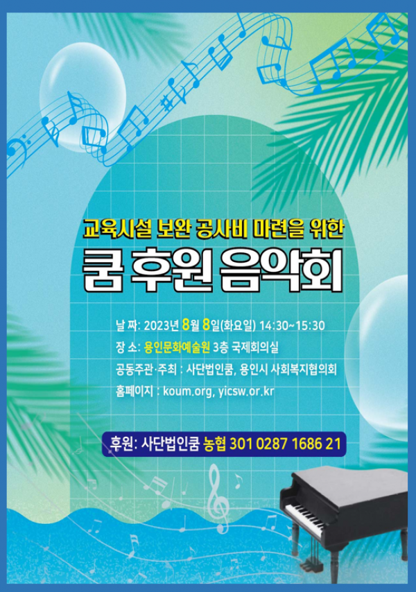 용인시사회복지협의회(회장 윤상형)와 사단법인 쿰(이사장 임영란)은 이번 8월 8일에 쿰 후원음악회를 개최한다. 두 기관은 지역내 장애인, 노인등 취약계층 지원에 많은 노력을 하고 있으며 이번 음악회를 통해 지역사회의 나눔이 고루 퍼질수 있도록 노력한다고 전했다. 이번 음악회는 쿰오케스트라의 ▲모차르트 심포니 40번 1악장을 시작으로 바이올리니스트 박모세의 연주와 성악가 임주…