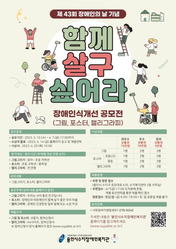 지구촌사회복지재단 용인시수지장애인복지관(관장 한근식)은 오는 4월 7일(금)까지 제 43회 장애인의 날을 기념하여 장애인식개선공모전 ‘함께 살구 싶어라’를 진행한다고 밝혔다. 용인시수지장애인복지관은 매년 4월 20일 장애인의 날을 기념하여 장애인식개선공모전, 피플퍼스트, 나눔행사 등 다채로운 활동을 펼치고 있다. 이번 장애인식개선공모전 ‘함께 …
