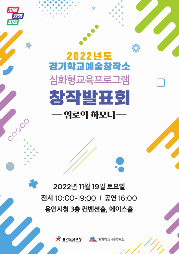 ◦ 19일 10:00~19:00 평면조형, 입체조형, 미디어영상 등 학생 작품 60점 내외 전시◦ 19일 16:00 힙합, 무용, 뮤지컬, 연극연출 등 학생 공연, 유튜브 경기도교육청 TV 채널 통해 실시간 방송 경기도교육청(교육감 임태희)은 오는 19일 용인시청 컨벤션홀과 에이스홀에서 경기학교예술창작소 창작발표회 ‘위로의 하모니’ 전시와 공연을 한다. 이번 발표회는 경기학교예…