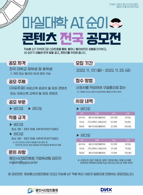 용인시산업진흥원(이사장 이상일, 이하 진흥원)은 고령자용 콘텐츠를 전국 대학생과 함께 모색하기 위해 7일부터 오는 25일까지 「마실대학 AI순이 콘텐츠 공모전」을 개최한다. 올해로 2회차를 맞는 본 공모전은 지능형 IoT 터치태그와 스마트폰을 통해 ‘마실대학 AI순이’앱에서 활용할 콘텐츠를 수집하기 위한 것으로 공모대상은 전국 대학교 재학생 및 휴학생이 개인 또…