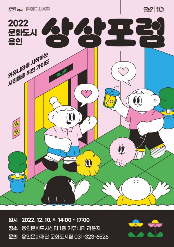 이미지 설명 : 포스터 이미지 (재)용인문화재단(이사장 이상일)은 오는 12월 10일 오후 2시, 용인시 기흥구에 위치한 용인 문화도시센터에서 ‘제2회 상상포럼’을 개최한다. 문화도시 시민 참여 촉진 및 차년도 사업 방향 수립을 위해 추진하는 ‘제2회 상상포럼’은 ‘커뮤니티를 시작하는 시민들을 위한 가이드’를 주제로, 지속가능한 용인의 커뮤니티 문화에 대한 시민들의 다양한 의견을 모아본…