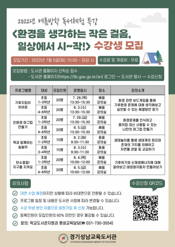 ◦7월 28일부터 8월 5일까지, 환경 관련 여름방학 독서체험 특강 진행◦환경과 기후 문제 살피고 인식 높이는 다양한 프로그램 운영◦참가 희망, 5일부터 도서관 누리집 통해 신청 경기성남교육도서관(관장 전성룡)이 5일부터 2022년 여름방학 독서체험 특강 ‘환경을 생각하는 작은 걸음, 일상에서 시~작’ 참가 신청서를 받는다. 이번 프로그램은 학생들에게 환경 문제에 대한 인식을 …