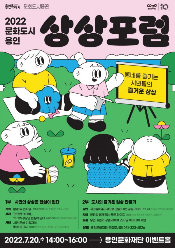 (재)용인문화재단(이사장 이상일)은 오는 20일 오후 2시, 용인문화재단 이벤트홀에서 ‘2022 문화도시 용인 상상포럼’을 개최한다. 문화도시 사업의 시민 참여 및 사업 성과의 환류 구조를 실험하기 위해 추진하는 이번 포럼은 ‘동네를 즐기는 시민들의 즐거운 상상’을 주제로 시민들의 일상 속 공원문화에 대한 다양한 의견을 나눌 예정이다. 문화도시의 비전과 방향을 담은 문화도시센터장의 환영사…