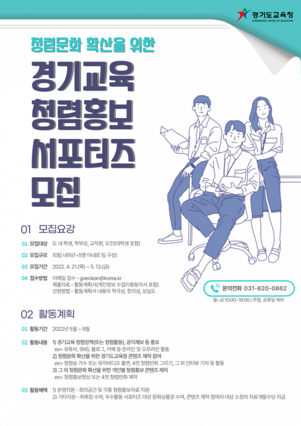 ◦ 학생, 학부모, 교직원, 지역 주민 대상 경기교육 청렴 홍보서포터즈 모집 ◦ 청렴 정책 홍보, 콘텐츠 제작 참여, 청렴 문화 확산 콘텐츠 제작 ◦ 활동 계획서 심사 후 10팀 내외 선발해 5월 말 도교육청 누리집에서 발표 [사진] 청렴 홍보서포터즈를 모집포스터 경기도교육청(교육감 이재정)이 도민을 대상으로 4월 21일부터 5월 13일까지 청렴 홍보서포터즈…