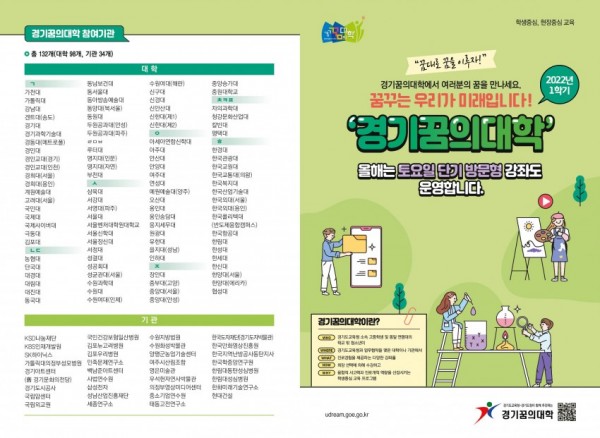 ◦ 경기꿈의대학 1학기, 4월 11일부터 6월 22일까지 8주간 운영◦ 132개 기관에 청소년 2만 2백여 명 수강◦ 방문형 408개, 거점형 405개, 온라인형 288개 등 총 1,101개 강좌 개설 경기도교육청(교육감 이재정)이 11일부터 6월 22일까지 경기꿈의대학 1학기 강의를 운영한다.1학기 강의는 98개 대학과 34개 참여기관에서 청소년 2만 2백여 명을 대상으로 …