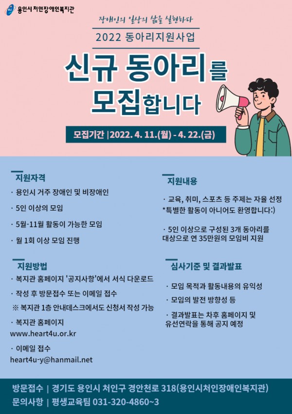 용인시처인장애인복지관은 용인시 장애인 평생학습도시 선정에 따른 ‘2022년 동아리지원사업‘에 신규 장애인 동아리를 모집한다. 모집 동아리는 용인시 거주 장애인 및 비장애인 5인 이상으로 구성된 모임으로 활동기간은 5월에서 11월(7개월)이며 동아리 주제는 교육·취미·스포츠 등 자유 주제이다. 모집 후 총 3개 동아리를 선발할 예정이다.  …