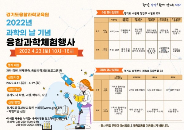 ◦ 4월 23일 제55회 과학의 날 기념 ‘융합과학체험행사’ 진행◦ 과학 강연, 천체관측, 학생체험 등 다양한 융합과학체험프로그램 운영◦ 15일부터 19일까지 경기도융합과학교육원 누리집에서 참가 신청 융합과학체험행사 안내문 경기도융합과학교육원(원장 이태헌)은 제55회 과학의 날을 기념해 학생, 학부모 등 도민을 대상으로 오는 23일 ‘융합과학체험행사’를 …