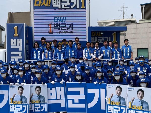 더불어민주당 백군기 용인특례시장 후보·시도의원 후보자 출정식 개최 백군기 더불어민주당 용인특례시장 후보와 시도의원 후보자들은 오늘(19일) 오전 10시 용인시 공세동 조정경기장에서 ‘더불어민주당 용인특례시 원팀선대위 출정식’을 개최하였다. 이에앞서 오전 6시에는 용인 중앙공원 현충탑을 참배하며 제8회 동시지방선거 공식선거운동을 시작하는 결의를 다졌다. 백군기…