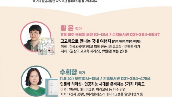 용인특례시(시장 이상일)가 올해 마지막 북 타임으로 3명의 작가 초청 강연을 마련했다. 북 타임은 작가와 독자를 잇는다는 취지로 시가 매월 진행하는 작가초청강연회다. 책을 통해 작가와 직접 소통할 수 있어 시민들의 호응이 크다. 올해 마지막으로 운영하는 북 타임에는 3명의 작가를 만날 수 있다. 먼저 ‘일상이 고고학’의 저자 황윤 작가의 강연회가 다음 달 3일부터 24…