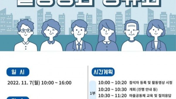 용인특례시(시장 이상일)는 7일 기흥구 마북동 소재 KB증권연수원에서 '2022 마을공동체 활동성과 공유회'를 열고 올해 활동 성과를 점검했다. 마을공동체 활동성과 공유회는 용인에서 활동 중인 마을공동체 관계자들이 한 자리에 모여 서로의 활동과 비전을 공유하는 자리다. 지난 2016년 처음 시작됐으며 올해로 일곱번째 행사다. 이날 공유회는 1~2부 행사로 나눠 진행됐으며 1…
