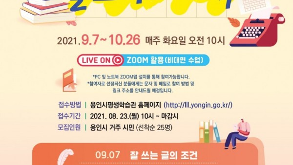 용인시가 오는 23일부터 제30기 용인시민대학의 온라인 강좌 ‘1인 출판을 위한 글쓰기 대학’의 수강생을 모집한다. 다음 달 7일부터 10월26일까지 화상회의 앱인 줌(ZOOM)으로 진행되는 강좌는 글을 잘 쓰고 싶지만 어디서부터 어떻게 시작해야 할지 막막해 어려움을 겪고 있는 시민들을 위해 마련했다. 강의는 총 7회 과정으로 진행되며 ‘글쓰기와 책쓰기’ , ‘당신도 불통이다’를 쓴 송정 칼럼니…