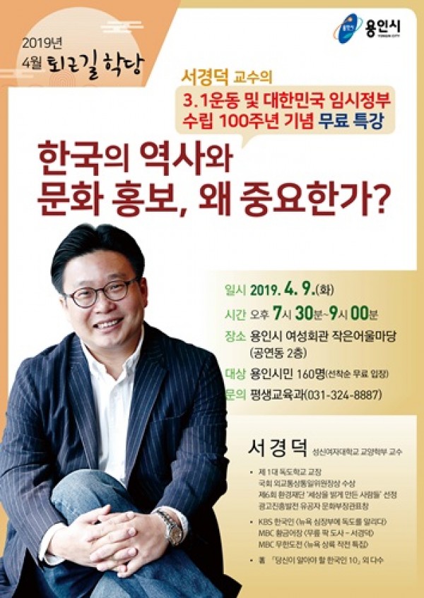 용인시는 낮 시간에 강연을 듣기 어려운 직장인을 대상으로 저녁에 진행하는 무료 인문학 강좌인 퇴근길학당을 운영키로 하고 9일 여성회관 작은어울림마당에서 서경덕 교수가 올해 첫 특강을 한다고 밝혔다. 이번 강연은 3. 1 운동 및 대한민국 임시정부 수립 100주년을 맞이해 ‘한국의 역사와 문화 홍보, 왜 중요한가?’를 주제로 해외 독립운동지와 역사적 …