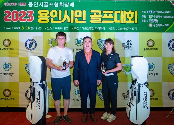 좌측부터 신페리오 남자부 1위 오영문학, 정채근 용인시골프협회 회장, 신페리오 여자부 1위 문영애 선수 용인시골프협회(회장 정채근) 주관으로 ‘since1998 용인시골프협회장배 2023 용인시민 골프대회’(이하 ‘골프협회장배 골프대회’)가 8월 21일 용인시 소재, 아시아나 CC 동 In·Out코스, 서코스에서 용인시민 160명이 참가한 가운데 성황리에 개최되었다, 이날 행사는 스트로…