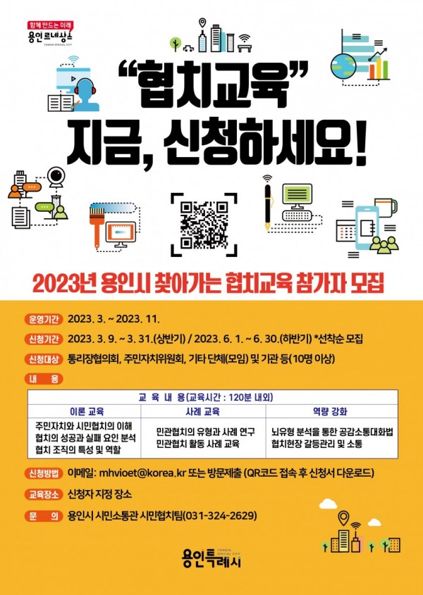 용인특례시(시장 이상일)는 시민들의 협치 역량을 높일 수 있도록 ‘찾아가는 협치 교육’을 제공키로 하고 오는 31일까지 참가자를 모집한다. 대상은 지역사회 문제와 협치에 관심이 있는 관내 10인 이상의 직장, 단체, 동아리, 소모임 등이다. 이들 모임에서 요청하면 시가 직접 전문 강사를 원하는 장소로 파견해 교육 프로그램을 제공한다. 교육은 협치의 개념을 쉽…