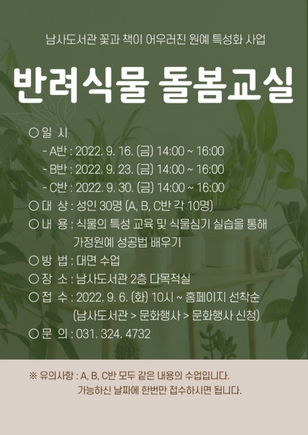 - 용인특례시 남사도서관, 9월 6일부터 30명 모집…가정원예 비법 등 강의 -