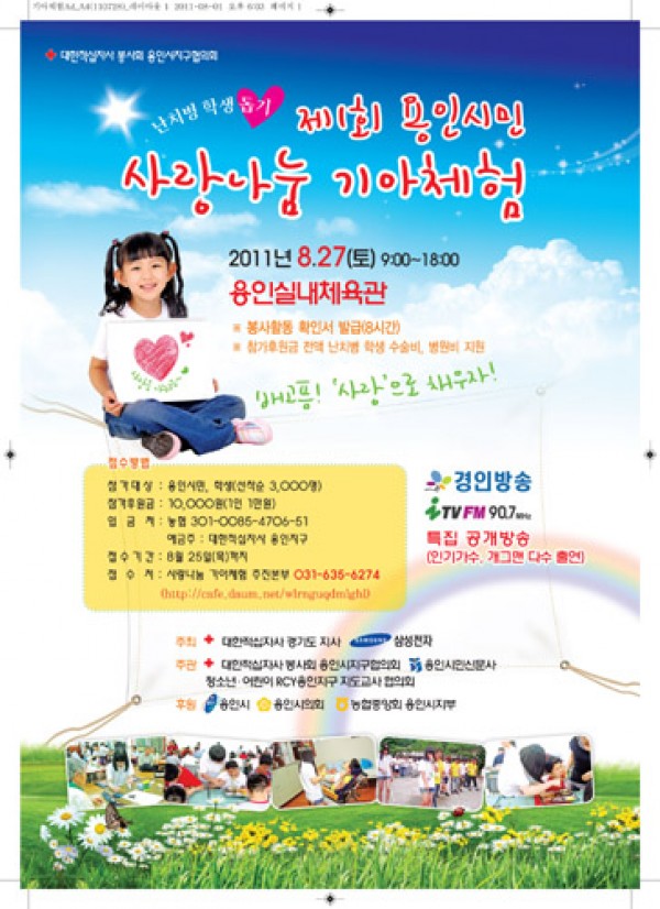 1만원의 사랑, 기아체험 행사에 함께 합시다! 용인시(시장 김학규)에서 한 끼 식사 비용을 어려운 이웃에게 후원하는 ‘용인시민 사랑나눔 기아체험’ 행사가 27일 용인실내체육관에서 열린다. 용인시에서 첫 개최되는 기아체험 행사이며 대한적십자사 봉사회 용인시지구협회가 주최·주관하며 청소년·어린이 RCY용인지구 지도교사협의회 등이 동참한다. 용인…