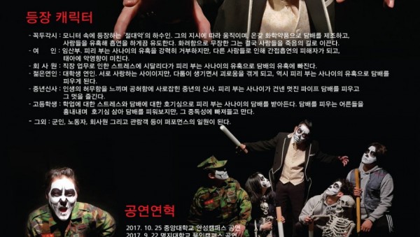 “2019 경기도 찾아가는 문화활동” 선정작,청소년 흡연 예방 퍼포먼스 “DEATH-DAY'“2019 경기도 찾아가는 문화 활동” 사업에 부천시 소재 극단 얘기씨어터컴퍼니의 청소년 흡연 예방 퍼포먼스 “Death-Day”가 선정되었다.일상생활을 영위하던 평범한 회사원, 젊은 연인, 중년 신사, 고등학생 등은 각기 직장 업무로 인한 스트레스, 공허함, 서로간의 다툼, 학업 스트레스 등으로 괴로워하던 중, 담배악마의 유…