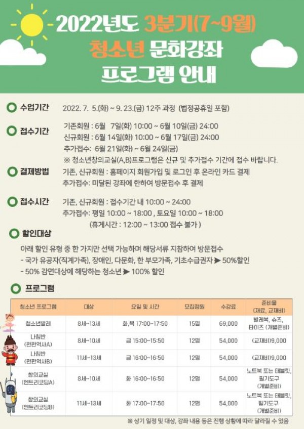 (재)용인시청소년미래재단 신갈청소년문화의집은 14일부터 6월 24일까지 11일간 청소년을 위한 3분기(7월~9월) 프로그램 수강생을 모집한다고 밝혔다. 7월 5일부터 개강하는 이번 문화강좌는 관내 8~13세 청소년을 대상으로 균형적인 발달을 위한 발레, 스토리텔링을 통한 역사 속 위인 탐구, 문제해결능력 향상을 위한 엔트리 코딩 등 3개 과정, 5개 강좌에 총 63명을 모집하며 접수방…
