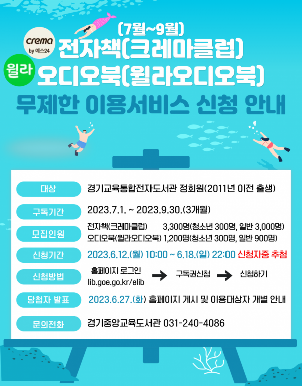 ◦ 6월 12일~18일까지 경기교육통합전자도서관 누리집에서 신청 가능 ◦ 중학생(2011년 이전 출생)이상 정회원 신청자 3개월 구독권 추첨 ◦ 편리성 위한 다양한 서비스 운영 및 구독권 제공 인원 확대 예정 경기중앙교육도서관(관장 조정수)이 오는 18일까지‘전자책‧오디오북 무제한 이용서비스’이용자를 모집한다. 이번 서비스는 경기도민이 ‘YES24 크레마클럽’과 ‘윌라오…